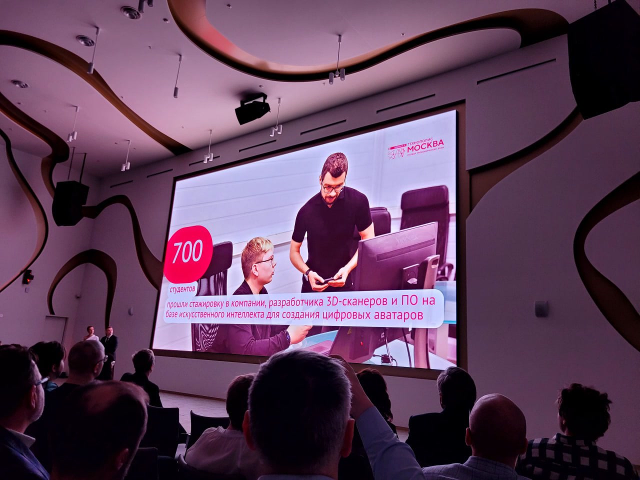 На огромном экране — цифры, за которыми стоит огромный труд нашей команды. 700 студентов прошли стажировку в Texel. Это наш вклад в то, чтобы у индустрии было профессиональное будущее.
